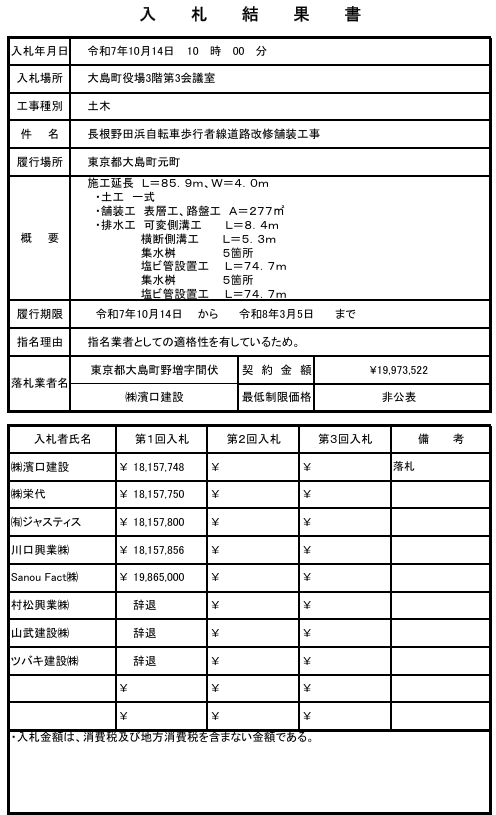 - 【2025年10月14日①】長根野田浜自転車歩行者線道路改修舗装工事※2円差の激戦