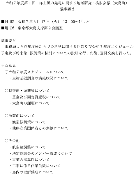 令和7年6月17日、「第1回洋上風力に関する地域研究・検討会議(大島町)」が開催されました。