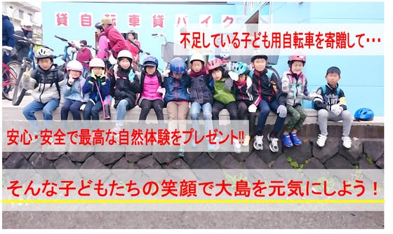 自転車が大活躍する「スプリング・アドベンチャーin大島」、その冒険体験を子ども達が安心して思いっきりチャレンジできるようにするには、不足している子ども用マウンテンバイクを整備する必要があります。そしてそんな子ども達の活気ある笑い声によって、...