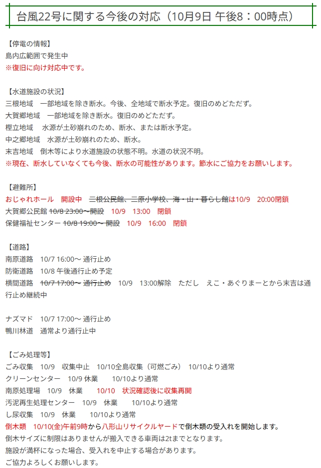 【2025年10月9日】台風22号に関する今後の対応(10月9日 午後8:00時点)