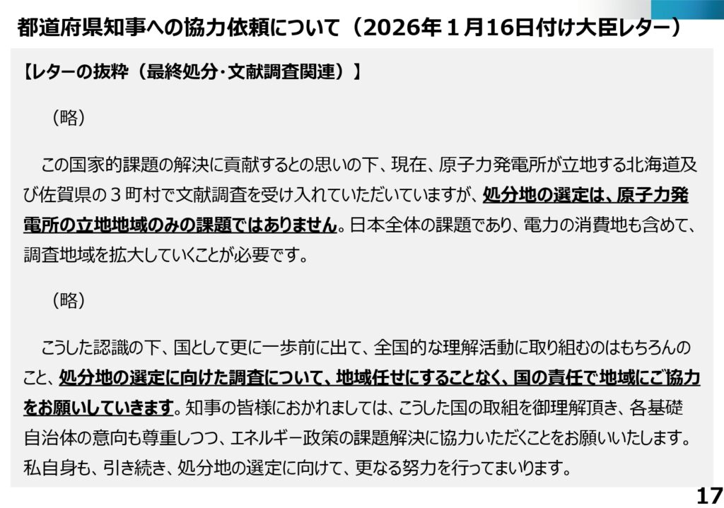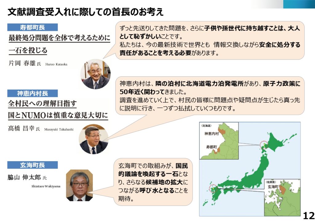 今回の受領に先立ち、最終処分の必要性や文献調査の内容について事前のご相談を受けた際に、国とNUMOには速やかに村民向けの説明会を開催し、地層処分や文献調査の内容などについて村民に丁寧な説明を行っていただくことをお願いいたしました。なお、申し入れに対して、私としては、説明会等における村民や村議会の意見などを踏まえながら判断してまいります。」