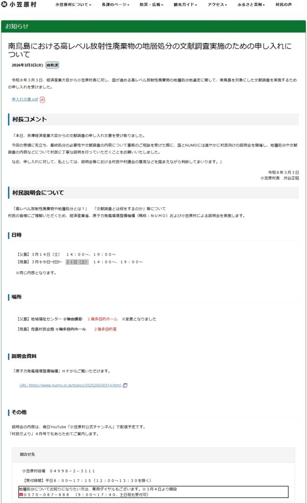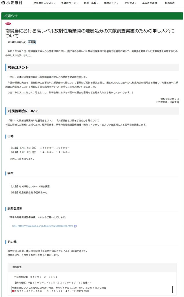 令和8年3月3日、小笠原村ホームページに「南鳥島における高レベル放射性廃棄物の地層処分の文献調査実施のための申し入れについて」に関する情報が掲載されました。