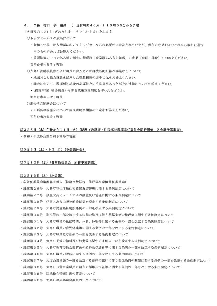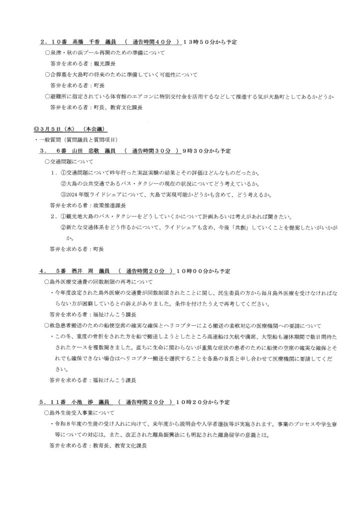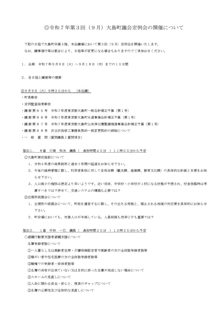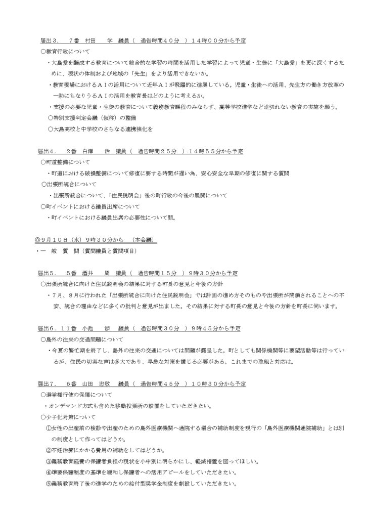 ・第3回定例会は9月頃開催(大島はまだ観光シーズン)のため、議員さんは本業を優先して、質問を作成しない可能性があります。